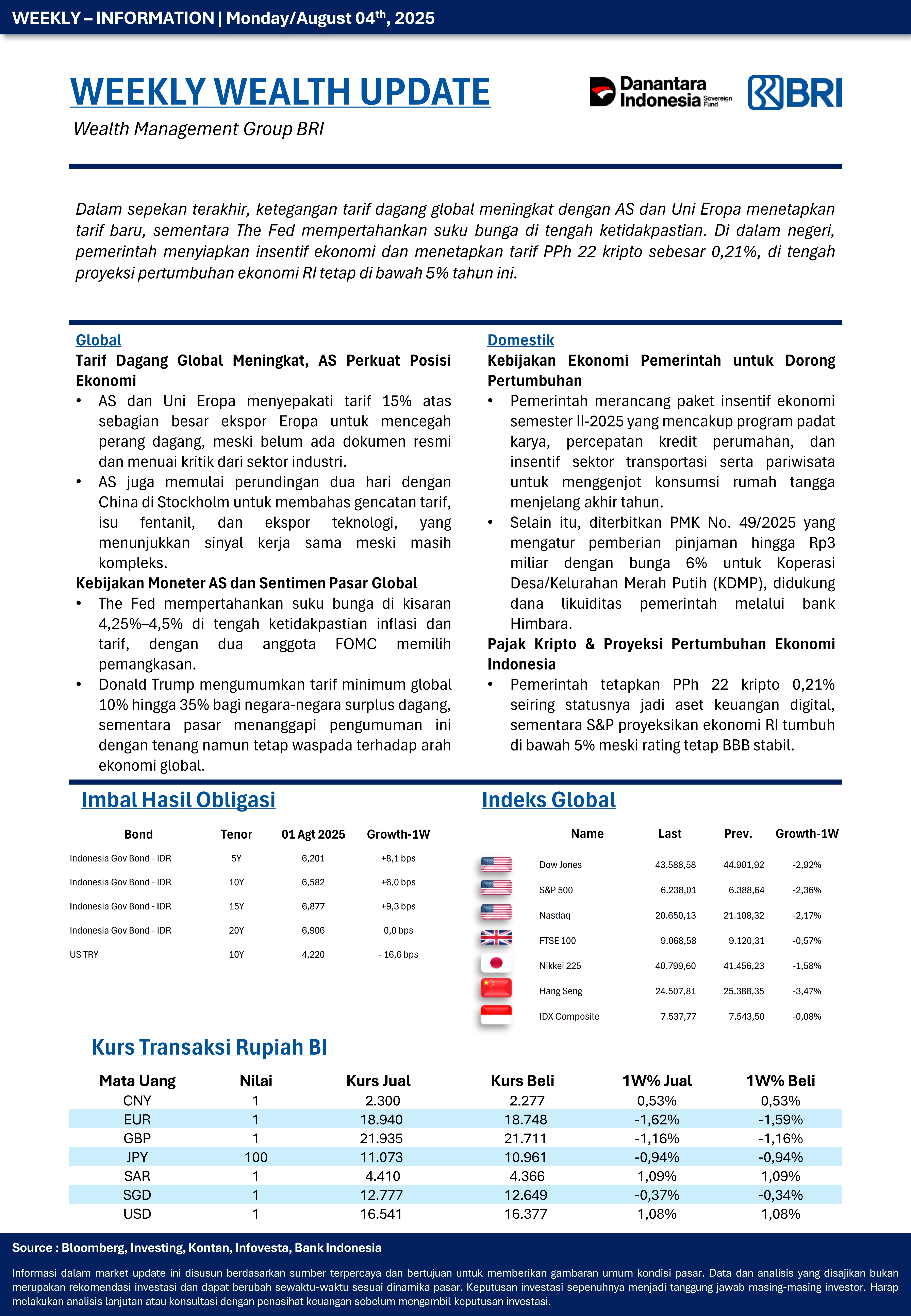Dalam sepekan terakhir, ketegangan tarif dagang global meningkat dengan AS dan Uni Eropa menetapkan tarif baru, sementara The Fed mempertahankan suku bunga di tengah ketidakpastian. Di dalam negeri, pemerintah menyiapkan insentif ekonomi dan menetapkan tarif PPh 22 kripto sebesar 0,21%, di tengah proyeksi pertumbuhan ekonomi RI tetap di bawah 5% tahun ini.