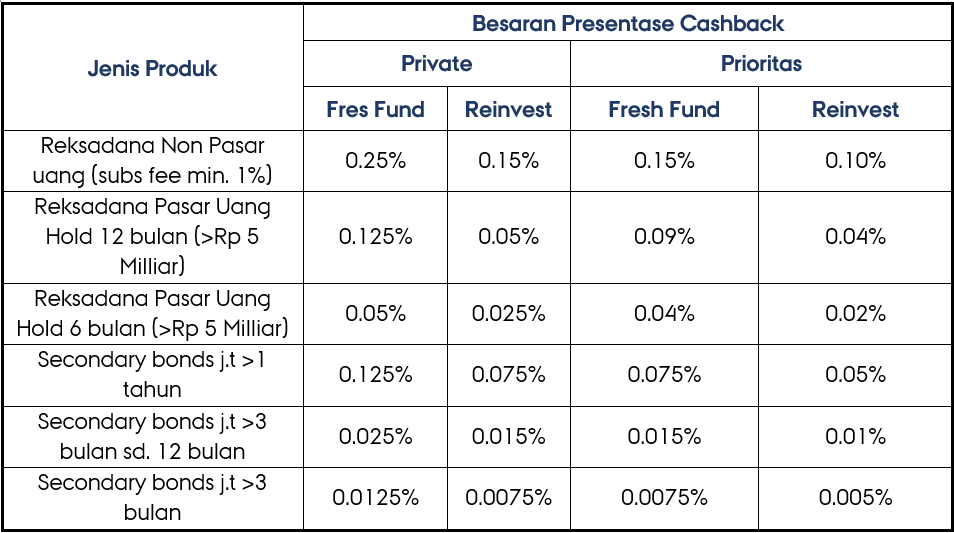 - Berikut disampaikan batasan minimum dan maksimum nominal investasi yang dapat diikutsertakan dalam program cashback ini: